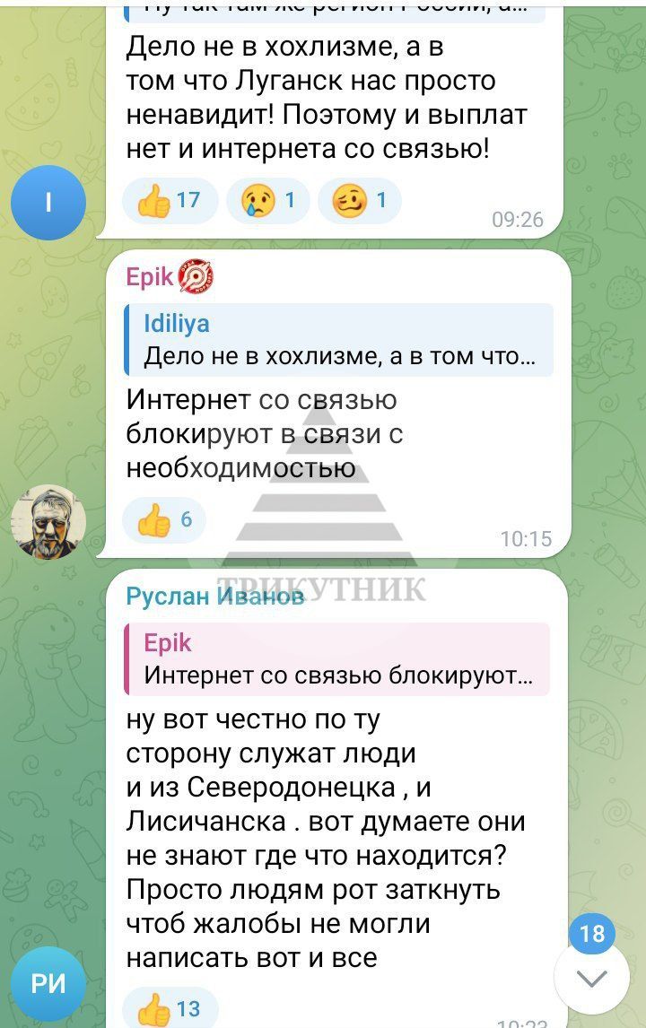 Судячи з повідомлень, зв'язок та інтернет у містах відключили, щоб люди не писали скарги на бездіяльність т.зв. влади. Ще пишуть, що у Луганську їх ненавидять.