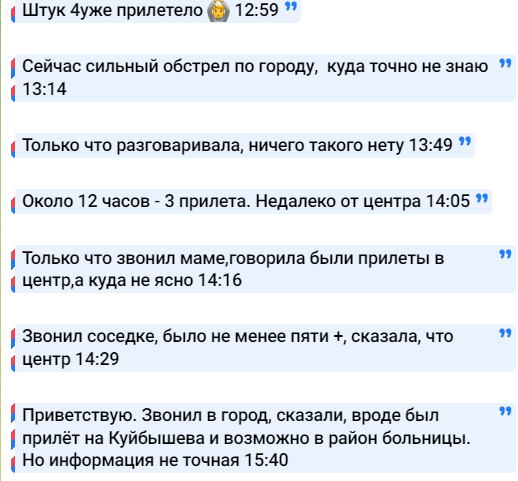"Штук 4 вже прилетіло", "Зараз сильний обстріл по городу, куди точно не знаю...".