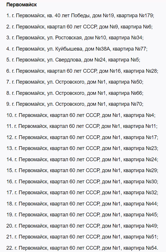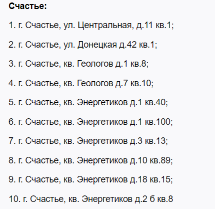 До нового списку увійшли понад 50 адрес. У Первомайську це 22 квартири у різних районах міста. У Голубівці (колишньому Кіровську) – 9 квартир. У Лисичанську – 30 квартир лише в одному будинку по кварталу Молодіжний. У Луганську – 8 квартир, а у Щасті – 10.