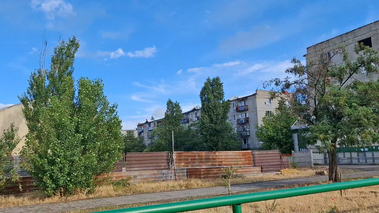 На них видно, як у будинках помітно постраждав фасад: вибито вікна, видно сліди руйнувань. Дерева навколо будинку частково приховують вид на руйнування, але загальний вигляд будинків свідчить про тяжкі наслідки обстрілу.