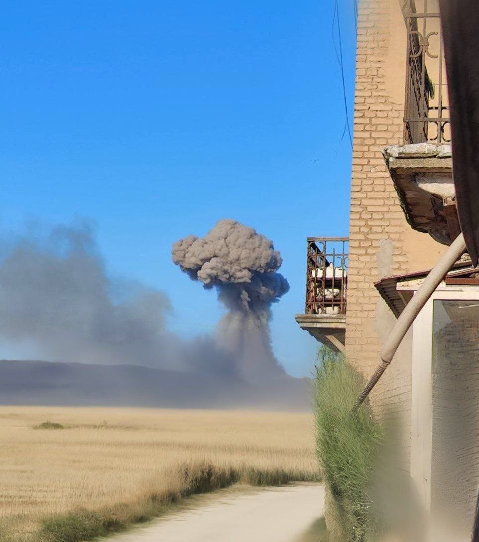 Фото та відео зроблені з місця події, показують значний вибух у віддаленні. На знімках видно густий стовп диму, що підіймається над місцем удару. На передньому плані можна побачити будівлі з балконами, що свідчить про близькість житлової зони до місця вибуху.