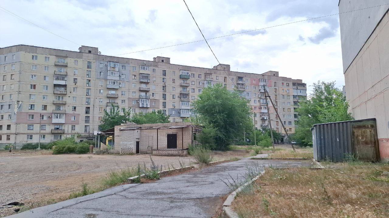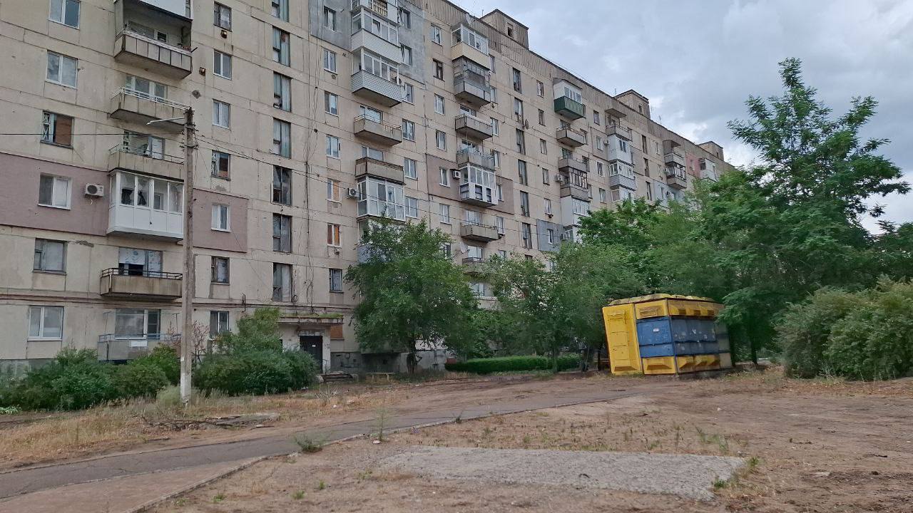 На фото видно багатоповерхові будинки в одному з районів міста, які оточені занедбаними будівлями та покинутими ділянками. Під’їзди виглядають запустілими, більшість вікон розбиті або затулені підручними матеріалами. Асфальт на дорозі пошкоджений, а навколо повно бур'янів та сміття. Зелені насадження навколо виглядають запущеними та неконтрольованими. Широкий порожній майданчик, де колись грали діти або стояли автомобілі, зараз виглядає як мертва зона. Одинокий червоний автомобіль на фоні багатоповерхових будинків створює атмосферу повного занепаду та безлюдності.