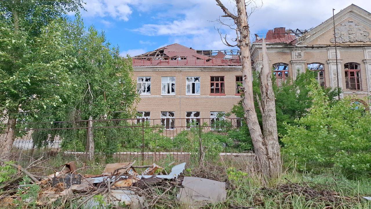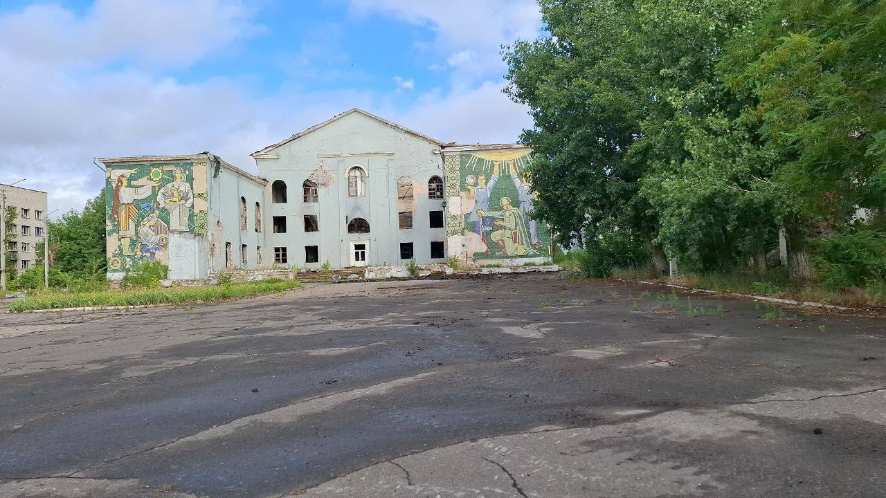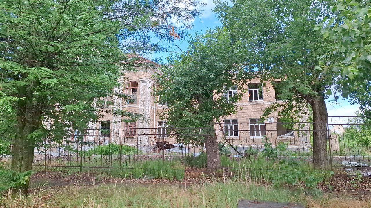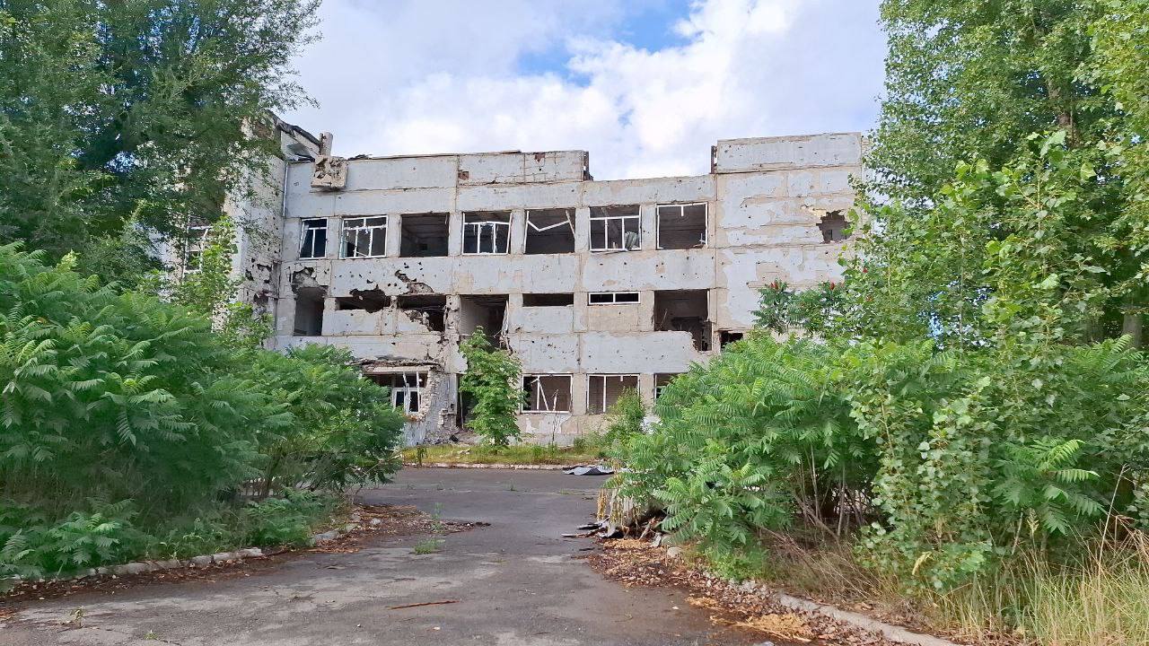 Вікна повністю розбиті, конструкції виглядають пошкодженими. Будівлі, ймовірно, колись служили адміністративними або освітніми установами, однак зараз вони стоять покинуті та зруйновані.