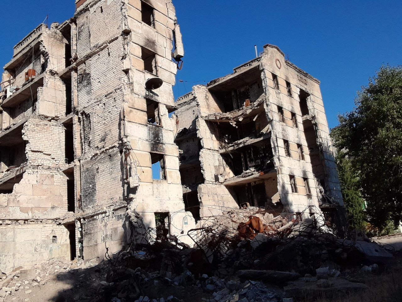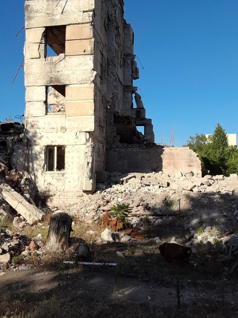 Багатоповерхівки, колись населені людьми, тепер стоять напівзруйнованими та пустими. Уламки, бетонні плити, зруйновані стіни та залишки конструкцій свідчать про масштабні руйнування, завдані обстрілами та бойовими діями.