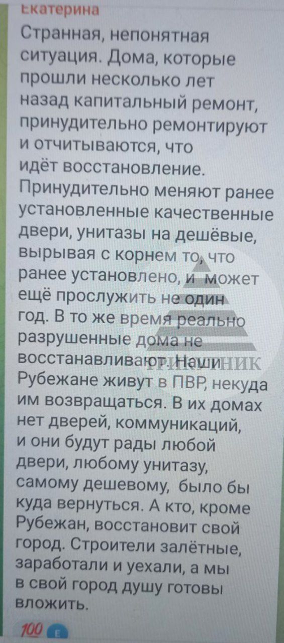 Ці повідомлення відображають загальний настрій та розчарування мешканців Рубіжного. Люди бачать, як їхнє місто руйнується не лише від бойових дій, а й від неякісних та недоречних ремонтів, що проводяться окупантами.