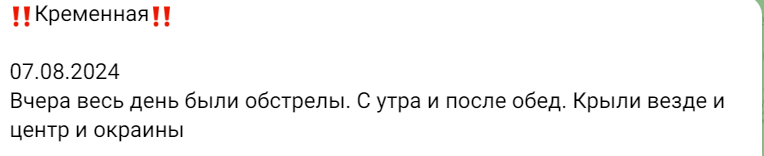 За даними місцевих джерел, протягом ночі з 7 на 8 серпня місто Кремінна Луганської області, яке знаходиться під тимчасовою окупацією, знову зазнало обстрілів. Повідомляється про мінімум п'ять "прильотів" снарядів у різні райони міста, включаючи центр та околиці.