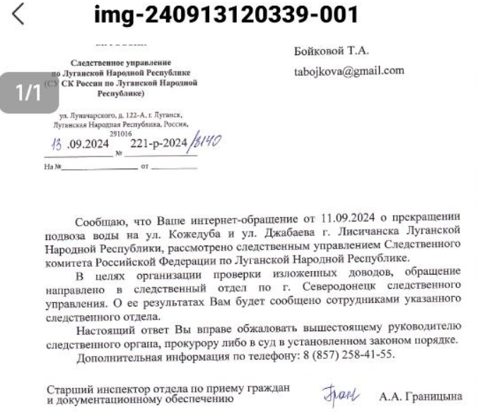 Одна з мешканок Лисичанська поділилася одержаною відповіддю на свою скаргу. Примітно, що звернення, спочатку направлене до Луганська, було перенаправлене до Сєвєродонецька. Відповідь, підписана А.А. Граніцин, старший інспектор відділу з прийому громадян, не містить конкретних рішень проблеми.