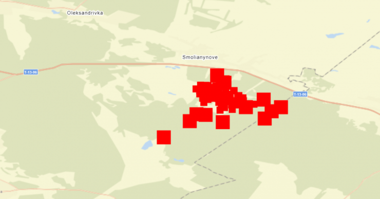 Супутникові знімки NASA зафіксували осередки пожеж на південь від Смолянинового 24 вересня. На ранок 25 вересня вогонь продовжує вирувати, хоча інтенсивність спалахів, судячи з карти, дещо знизилася.