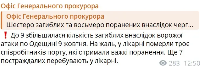 На Одещині збільшилася кількість жертв внаслідок російської атаки 9 жовтня. Офіс генерального прокурора повідомив, що троє співробітників порту, які зазнали тяжких поранень, померли в лікарні. Таким чином, загальна кількість загиблих досягла дев'яти.