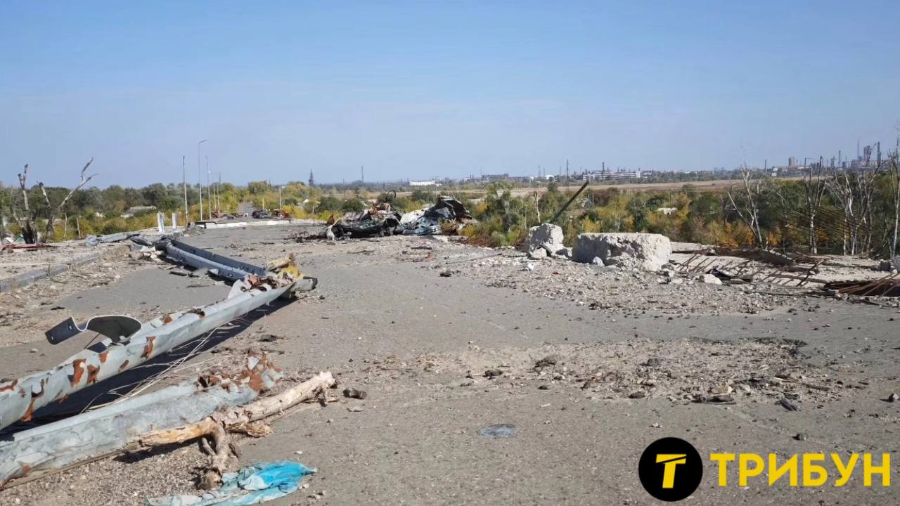 На фото показано всім добре знайоме місце - вид на Пролетарський міст. Дорога розбита, мостом переправа не здійснюється, оскільки він пошкоджений. Незважаючи на те, що місто перебуває в окупації вже третій рік і третій рік ворожа пропаганда розповідає казки про те, як усі "зажили", нікому навіть на думку не спадає прибрати згорілі автомобілі з дороги.