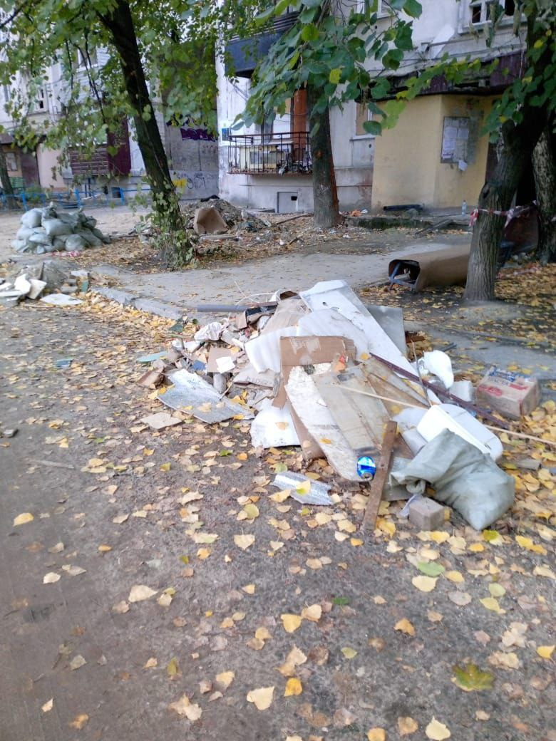 "Ці фотографії - крик душі мешканців. Будівельники викидають сміття з вікон і не реагують на наші прохання прибрати за собою. Лавочки біля під'їзду розбиті, а сходи знищені. Такий самий бардак твориться і всередині під'їзду. Ми самі змушені прибирати сміття після будівельників", - діляться вони.