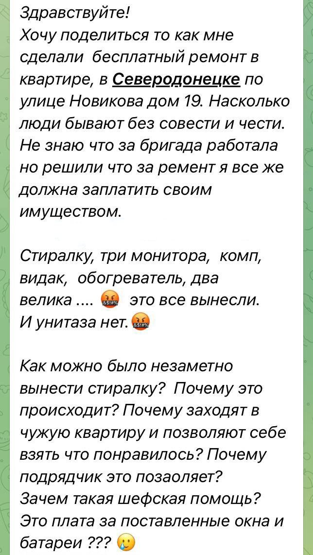 Мешканці Сіверськодонецька та Лисичанська у чатах детально розповідають про ситуації, коли бригади забирають із їхніх осель особисті речі, часто цінні побутові прилади та електроніку. Одна з жінок поділилася своїм досвідом в чаті: вона повернулася додому після "благодійного ремонту" і виявила, що з її квартири зникли пральна машина, кілька моніторів, комп’ютер, відеомагнітофон, обігрівач, велосипеди, і навіть унітаз.