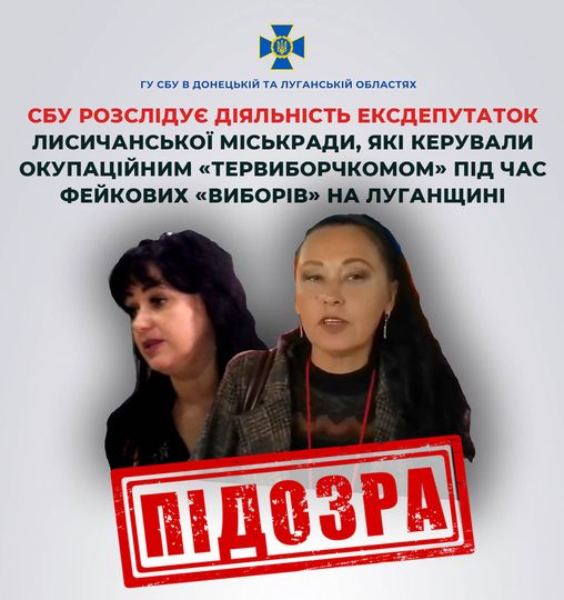 Служба безпеки України завершила збирання доказової бази, що підтверджує співпрацю з окупаційною владою двох колишніх депутаток Лисичанської міськради, які керували організацією псевдовиборів на тимчасово окупованій Луганщині.