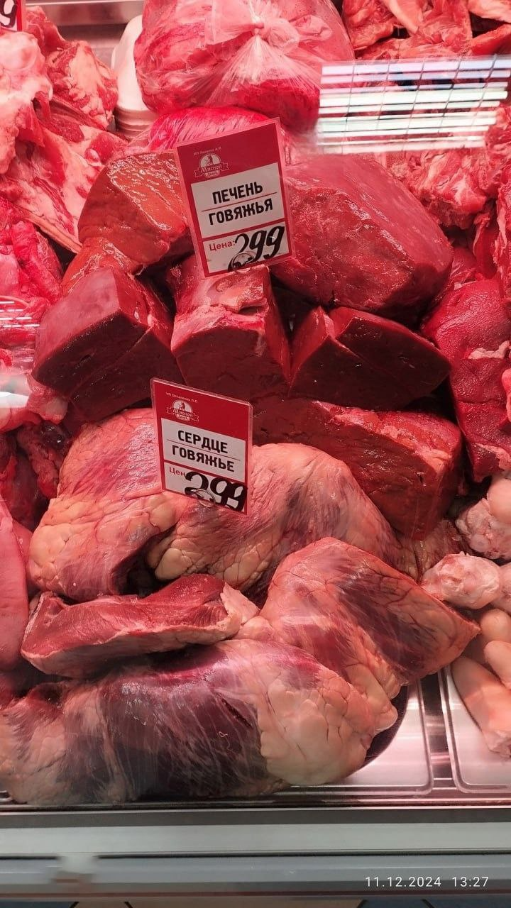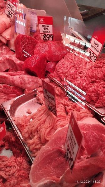 На фотографіях видно, що ціни на м'ясо та овочі варіюються. Так, вартість сала коливається від 100 до 650 рублів за кілограм (приблизно 40-250 гривень). Картоплю можна придбати за 80 рублів, а помідори – за 250 рублів. М'ясо також коштує чималих грошей: яловичина оцінюється в 900 рублів за кілограм, тоді як фарш із яловичини можна знайти за 330 рублів. Кури бройлерні коштують близько 225 рублів, а куряче філе - 400 рублів.