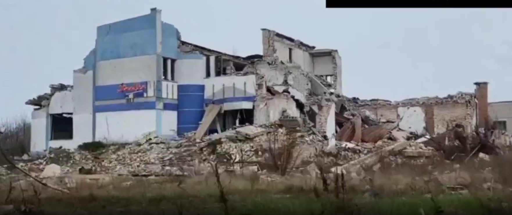 На відео можна побачити будівлю, яка, ймовірно, була комерційним об'єктом, яка практично повністю знищена в результаті бойових дій.