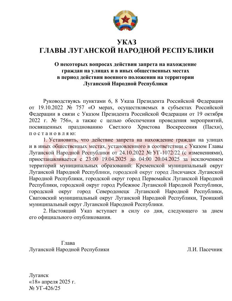 На тимчасово окупованій території Луганської області, яку російські окупанти продовжують називати так званою "ЛНР", вирішили тимчасово скасувати комендантську годину з нагоди святкування Великодня.