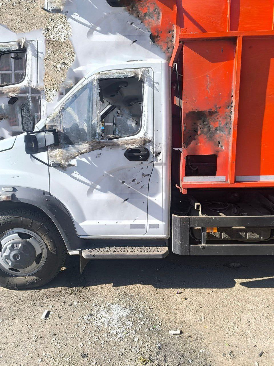 - Комунальний сміттєвоз – спеціалізована машина, яка вже раніше потрапляла під обстріли, отримала нові ушкодження й наразі виведена з експлуатації.