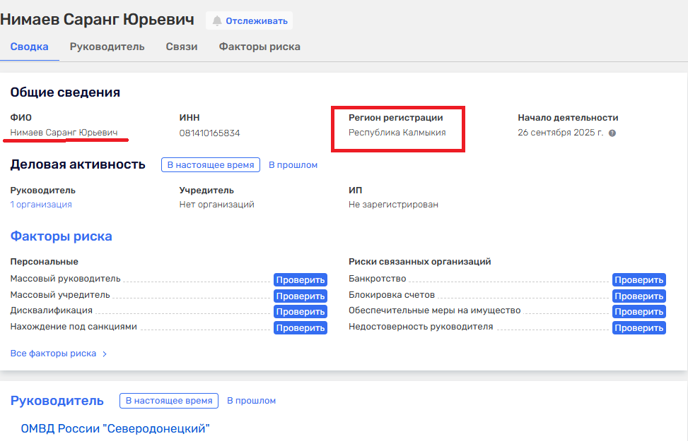 26 вересня тимчасово виконуючим обов’язки начальника “відділу внутрішніх справ” окупованого Сіверськодонецька став Німаєв Саранг Юрійович, уродженець Калмикії. Про нього майже немає відкритої інформації, однак дослідники встановили, що його податковий номер зареєстровано саме в цьому регіоні РФ.