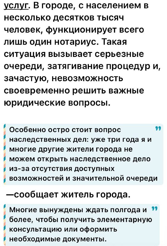 Мешканці повідомляють, що через відсутність доступних можливостей та значну чергу багато хто з них змушений чекати пів року і більше, щоб лише отримати консультацію або розпочати процес оформлення документів, не кажучи вже про завершення справи. Затримка зі спадковими справами на три роки стала тривожним свідченням повного колапсу юридичної інфраструктури в місті.