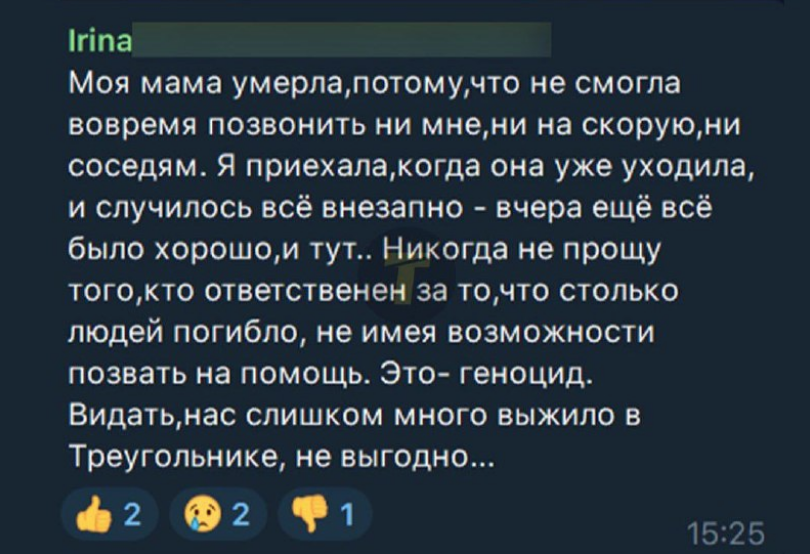 За словами користувача мережі, у випадку, коли потрібно було швидко діяти, не вдалося здійснити дзвінок медикам. Росіяни вихваляються впровадженням локальної мережі, проте ніякого позитивного ефекту немає. У мережі таке ставлення до міста та його мешканців навіть називають геноцидом.
