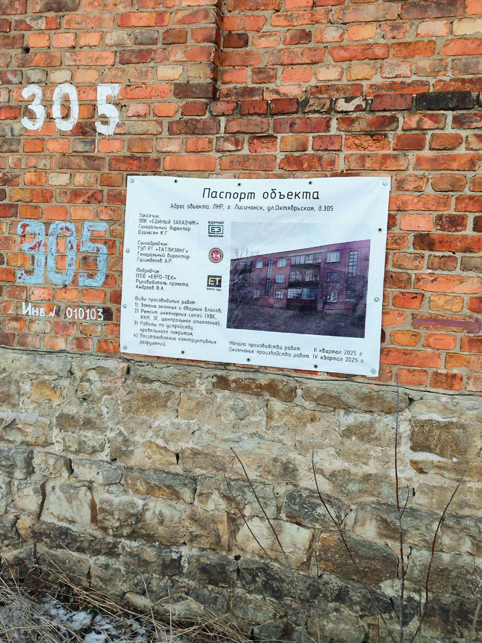 На фото показано будинок на вул. Світличного (до перейменування - Жовтнева). Усюди тріщини, штукатурка просто відвалюється. При цьому на фасаді красується плакат російського підрядника про те, що ремонтні роботи було завершено у 4-му кварталі 2025 року.
