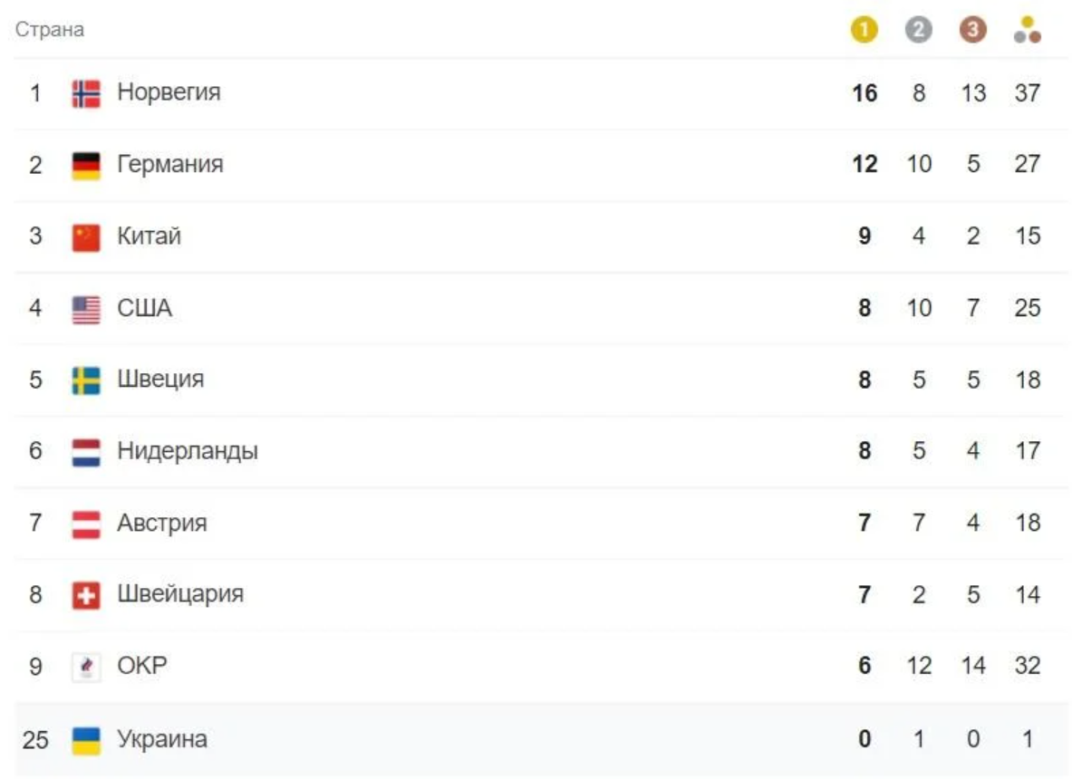 У підсумковому медальному заліку Україна на 25 місці. Срібну медаль для нашої олімпійської збірної завоював фрістайліст Олександр Абраменко у змаганнях з лижної акробатики.
