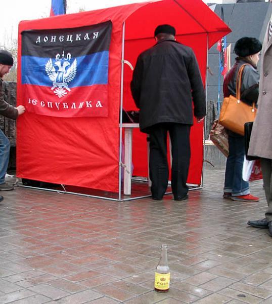 Збір громадської думки проводився в наметах Компартії, логотип якої був завішений прапором Донецької республіки