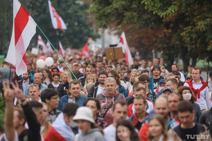 Близько полудня з різних районів Мінська почали висуватися групи людей, які йшли до центру. Дощ не завадив проведенню маршу: люди несли біло-червоно-білі прапори і парасольки.