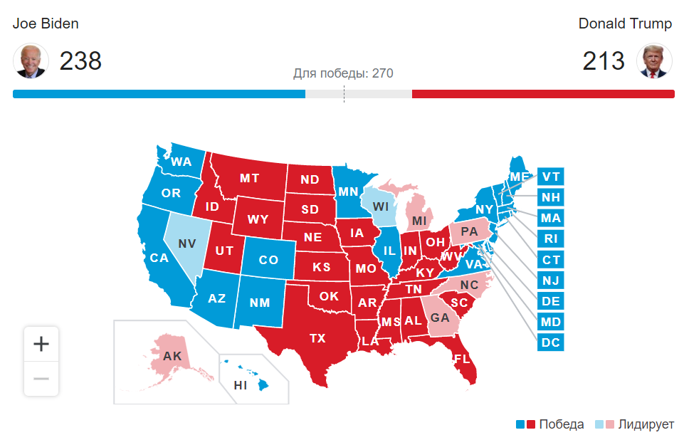 За даними сервісу Google, на поточний момент у Байдена 238 голосів, у Трампа - 213. Однак підрахунок голосів виборців в ключових штатах ще триває.