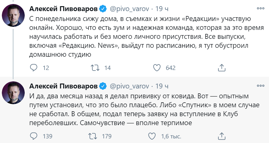 Російський журналіст Олексій Пивоваров, який недавно зробив щеплення вакциною від коронавіруса "Супутник V", повідомив, що заразився.