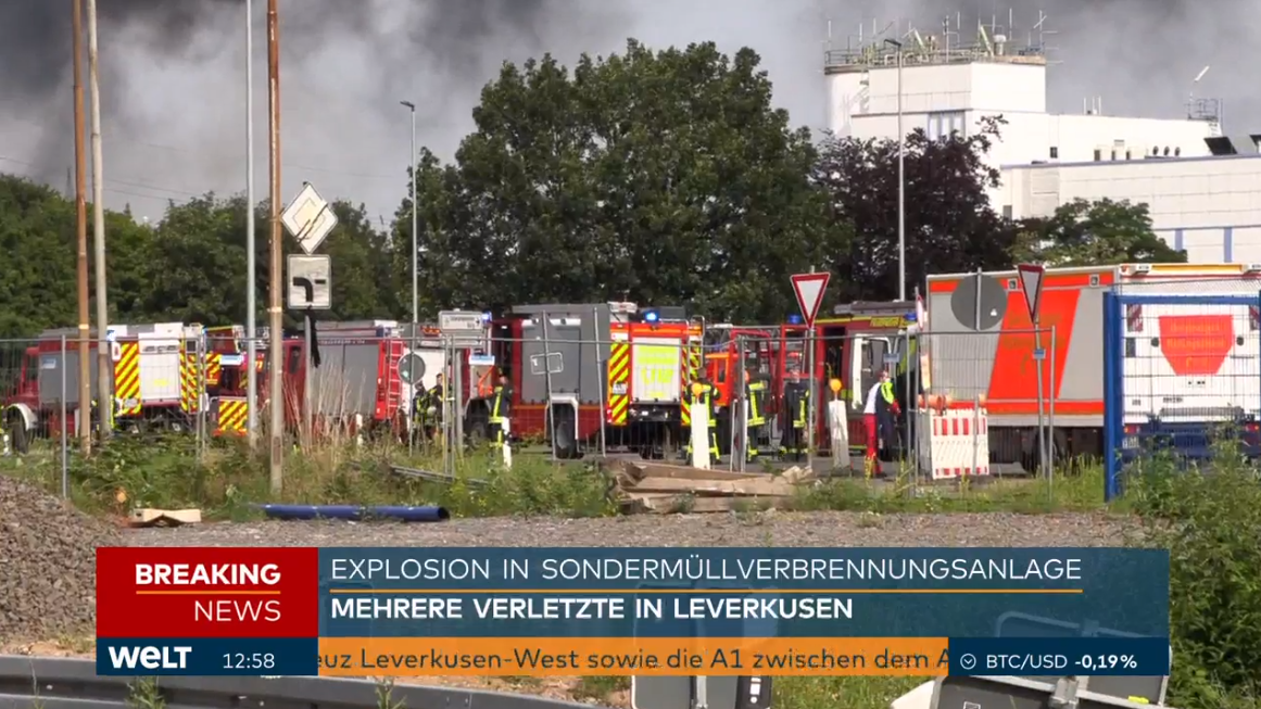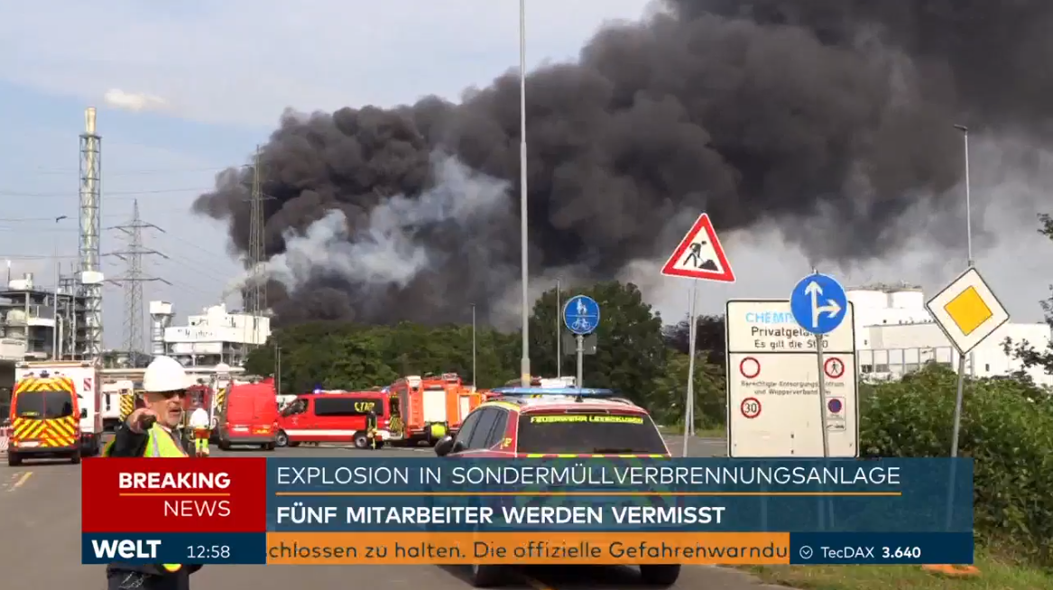 За даними Bild, загорівся перевантажувальний комплекс нафтобази компанії Currenta. Вогонь загрожує поширитися на сусідню будівлю, де зберігається до 100 тисяч літрів легкозаймистих розчинників.