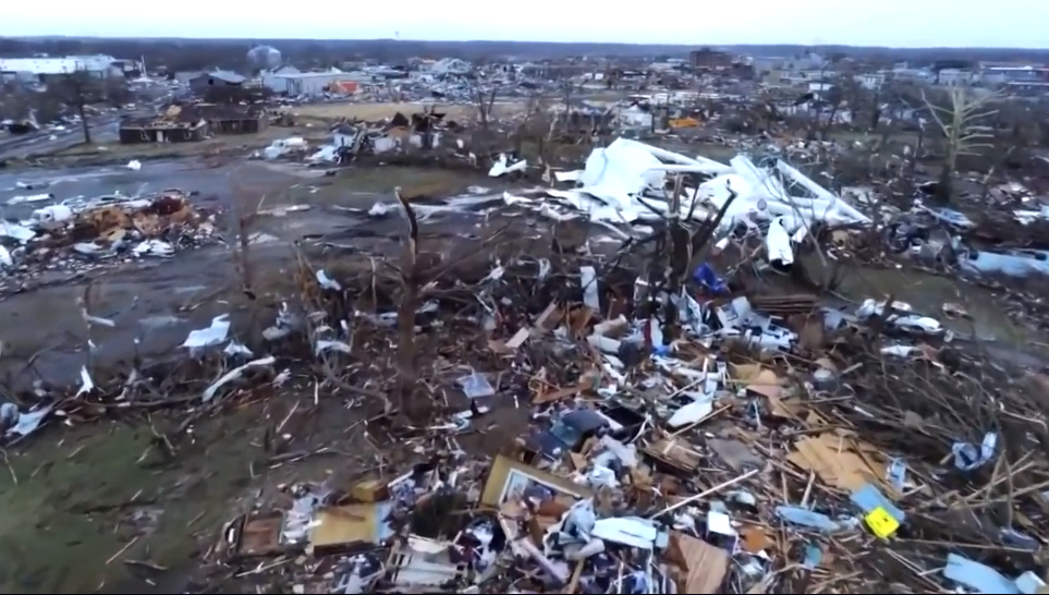 У мережі з'явилося відео з Мейфілда після атаки торнадо. Мало яким будівлям вдалося вціліти. На вулицях лежать перевернуті машини та велика кількість сміття.