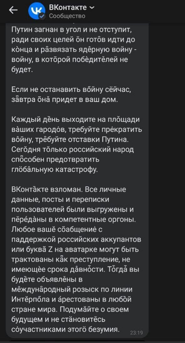 Також у повідомленнях йдеться, що ВКонтакте зламано, всі особисті дані, пости та переписки були вивантажені та передані до компетентних органів - будь-яке повідомлення з підтримкою окупантів або буква z на аватарці можуть бути трактовані як злочин, що не має строку давності, і такі користувачі можуть бути оголошені у міжнародний розшук по лінії Інтерполу.