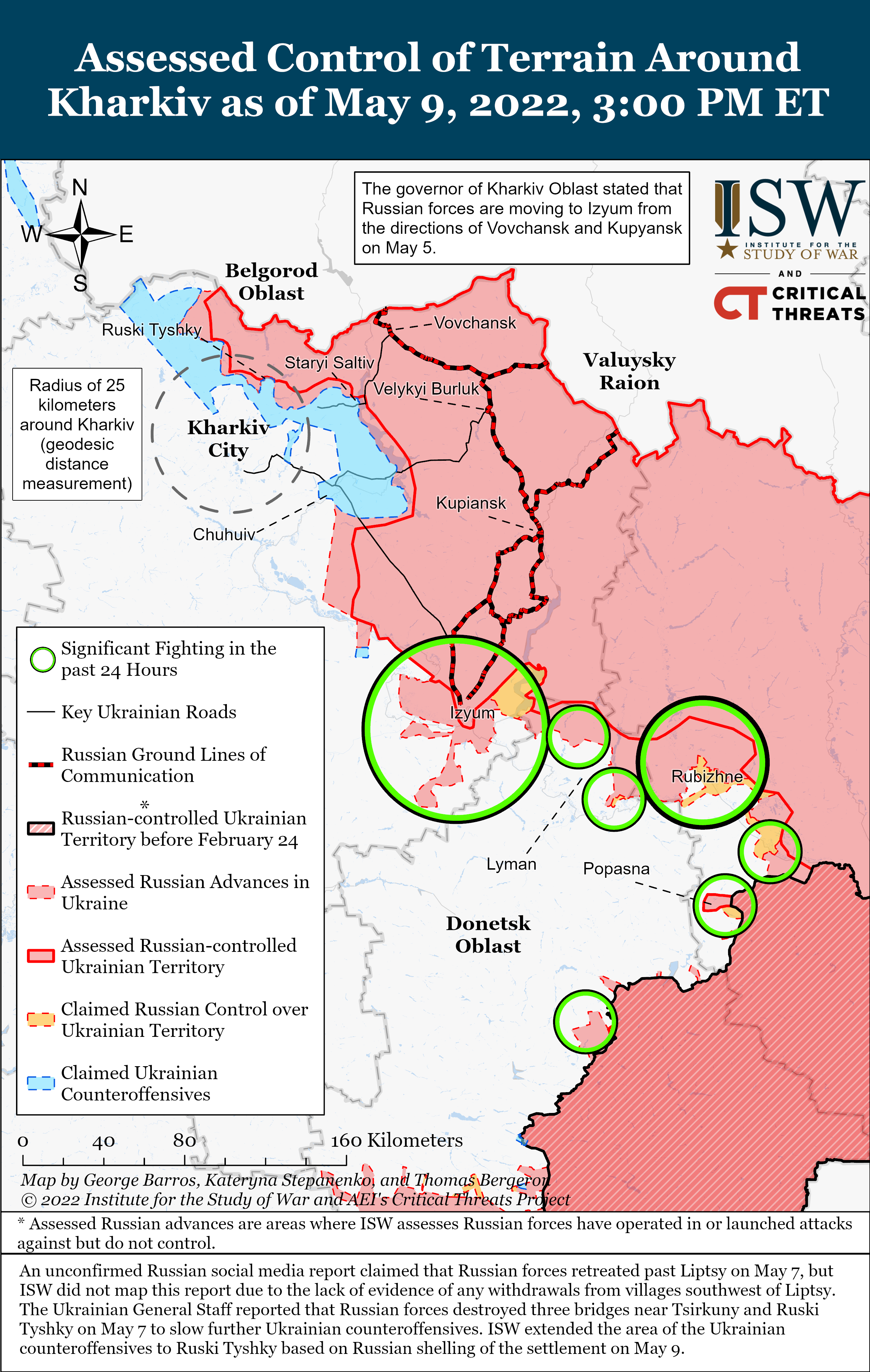 Експерти додають, що війська Росії не робили підтверджених наступів на південний схід або південний захід від Ізюма 9 травня. Однак, ймовірно, намагаються зосередити сили, необхідні для відновлення наступальних операцій найближчими днями.