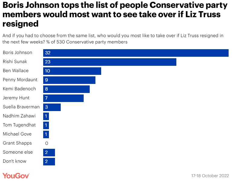 Варто зазначити, що дані опитування членів Консервативної партії за 17-18 жовтня, опубліковані на сервісі YouGov, також підтверджують симпатію до Джонсона. Більшість торі хочуть, щоб уряд очолив Джонсон. Кожен третій консерватор (32%) вважає, що саме екс-прем'єр є підходящим кандидатом.