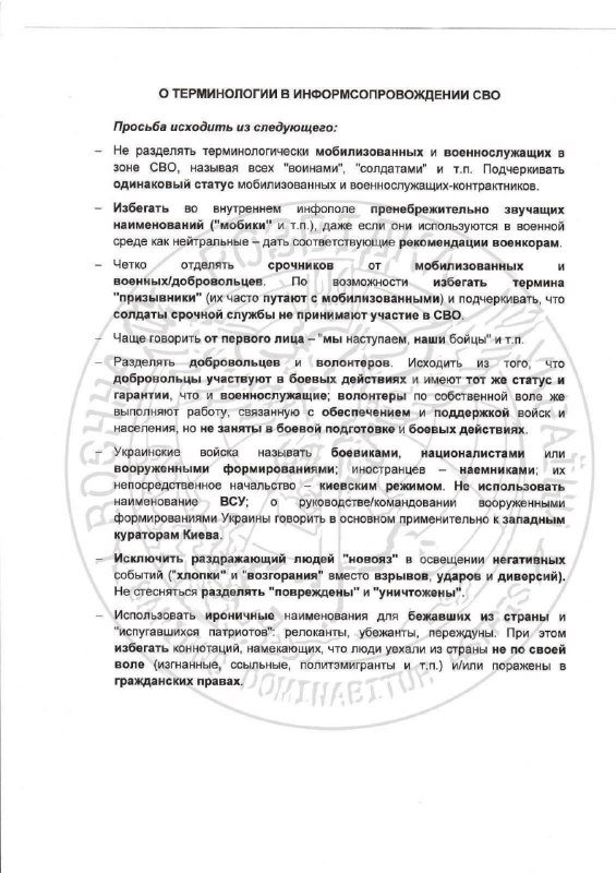 - ВСУ, згідно з методичками, рекомендують називати "бойовиками" та "озброєними формуваннями". А також у жодному разі не використовувати абревіатуру "ЗСУ";