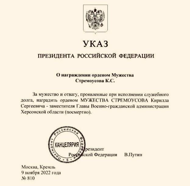 Відповідний документ з'явився у мережі. У ньому значиться, що Стремоусов "орденом за мужність" нагороджується "за мужність та відвагу, виявлені під час виконання службового обов'язку".