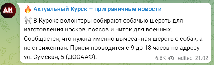"Пілотний проект - в'язані речі з собачої шерсті. У нас, як у кінологів, власників собак, попросили зібрати шерсть. 10 якісно вичесаних шпиців - шкарпетка для солдата, а з кавказця можна і светр зв'язати. Шерсть з будь-яких собак можна використовувати для пошиття поясів, щоб натруджені спини хлопців не боліли та були у теплі", - розповіли у групі "Собачники. Курськ".