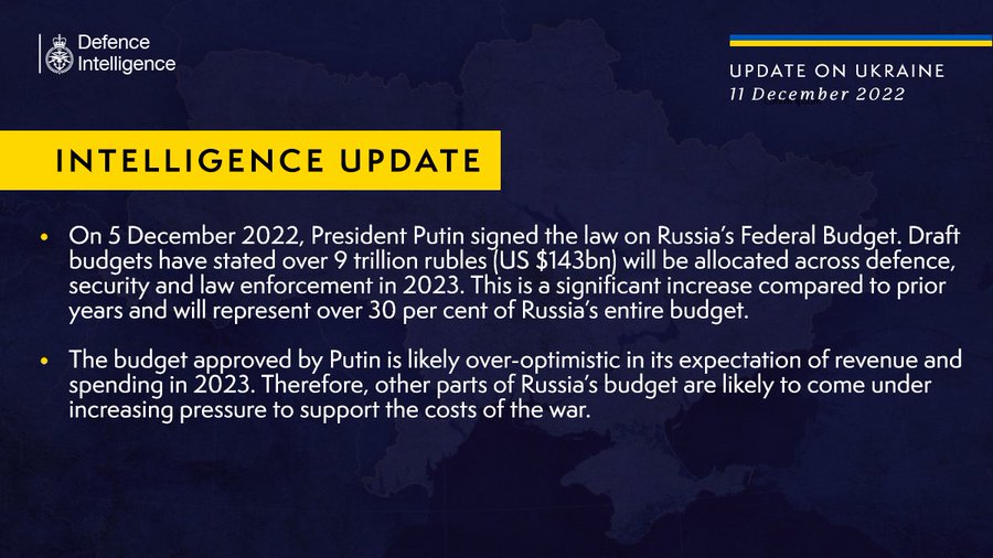 Затверджений Путіним бюджет, ймовірно, надто оптимістичний у своїх очікуваннях щодо доходів та видатків у 2023 році, вважають аналітики британської розвідки. Тому інші частини російського бюджету, швидше за все, зазнають дедалі більшого тиску для підтримки витрат на війну.