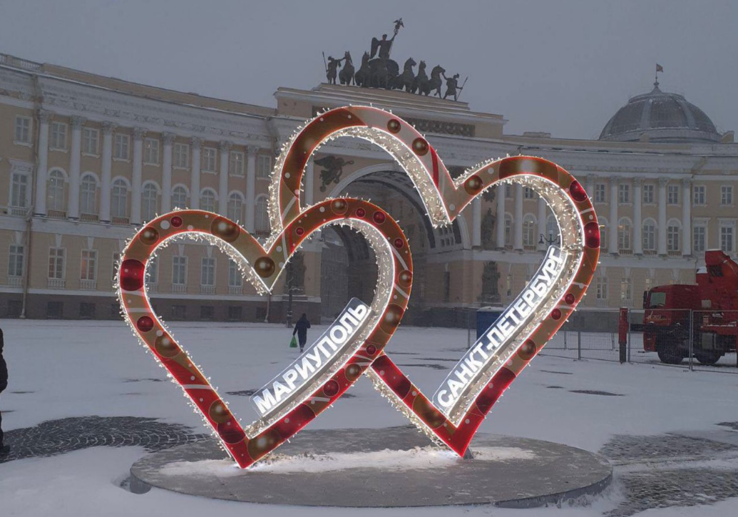 У російському Санкт-Петербурзі на центральній площі робітникам довелося розбирати встановлену менше тижня тому інсталяцію з двох переплетених сердець. Новорічну інсталяцію було встановлено на честь "братства" з Маріуполем.