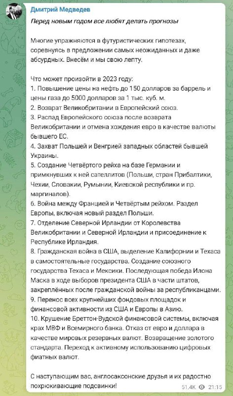 Такий "прогноз" придумав і видав у Telegram-каналі заступник голови Ради безпеки РФ Дмитро Медведєв, передає Час Пік.