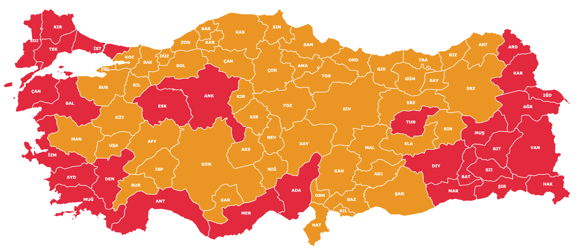 Центральна частина надала перевагу Ердогану (помаранчевий колір). Однак у столиці держави, Анкарі, лідером підтримки став Киличдароглу.