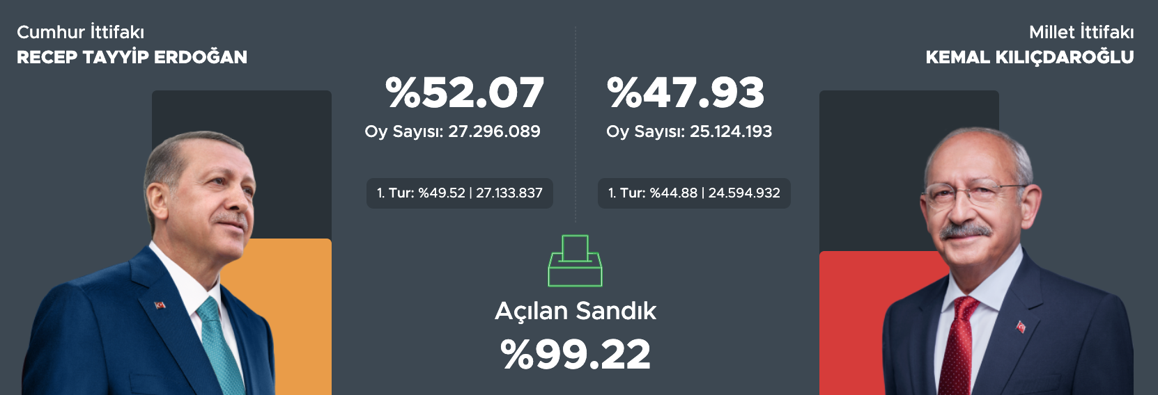 Станом на 21:25 опрацьовано 99,22% голосів. Ердоган лідирує - 52,07% виборців проголосували за нього. Киличдароглу набрав 47,93% голосів. Таким чином, ймовірно, Ердоган залишиться на посаді президента на наступні п'ять років.