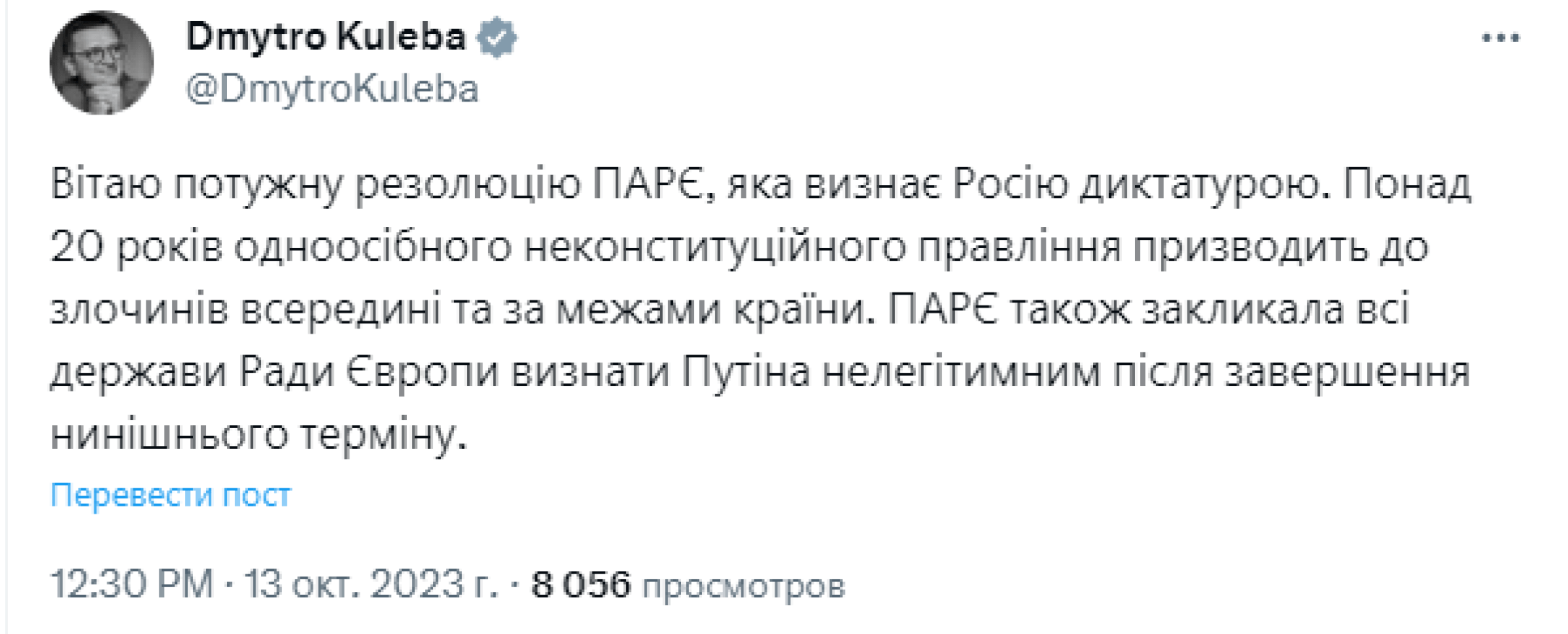 Міністр закордонних справ України Дмитро Кулеба привітав "потужну" резолюцію ПАРЄ і зазначив, що понад 20 років одноосібного неконституційного правління призводить до злочинів усередині та за межами країни.