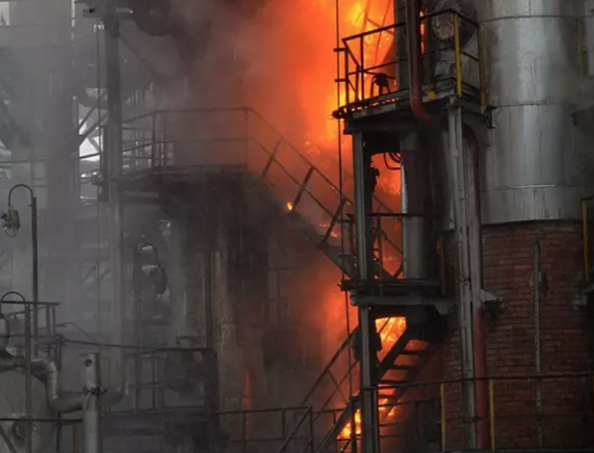 На відео, яке з'явилося в мережі, можна побачити "приліт" дрону по підприємству і подальше займання.