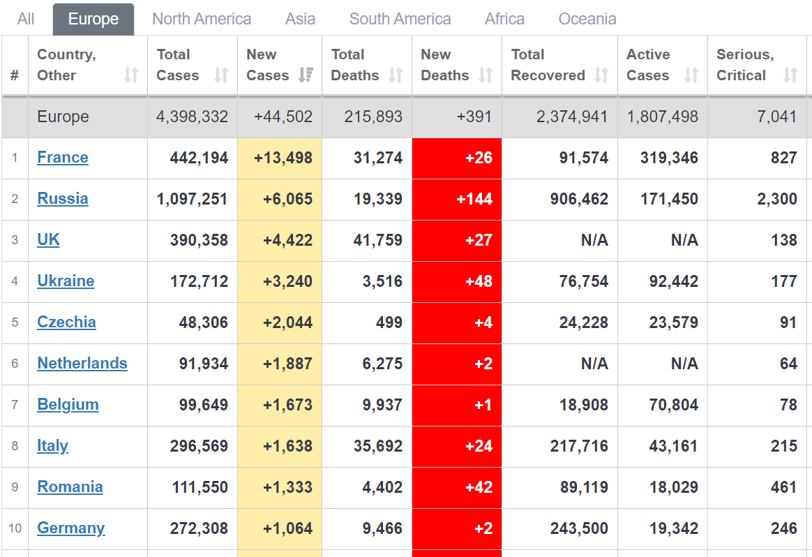 За приростом нових випадків коронавірусної хвороби Україна посіла 4-е місце в Європі (+3240 нових випадків за добу) після Франції, Росії та Великобританії.