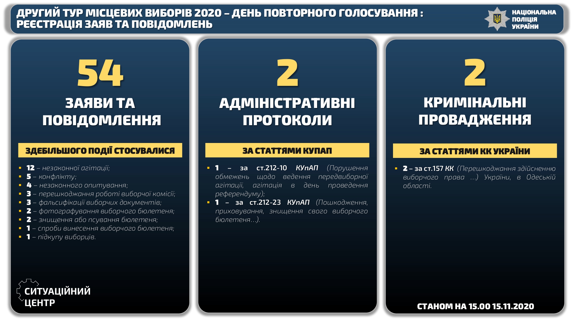 Станом на 15:00 до підрозділів поліції надійшло 54 повідомлення, пов’язаних із виборчим законодавством. Зокрема 18 – у Херсонській, 13 – в Одеській, 12 – у Київській, по 4 – у Донецькій та Сумській, 3 – у Волинській областях.