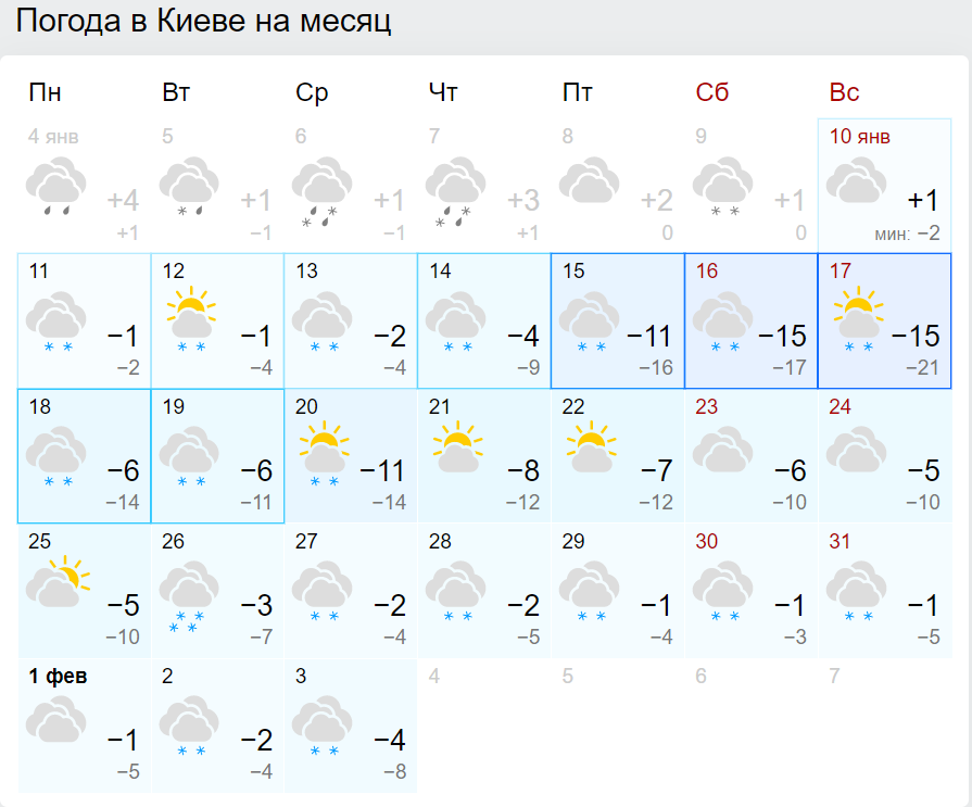 За прогнозами синоптиків, в Україні відчутно похолодає з 14 січня. Так, за даними ресурсу Gismeteo, у Києві наприкінці наступного тижня очікуються денні температури -11 -15, а вночі можливо від -16 до -21 градуса.