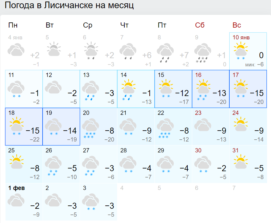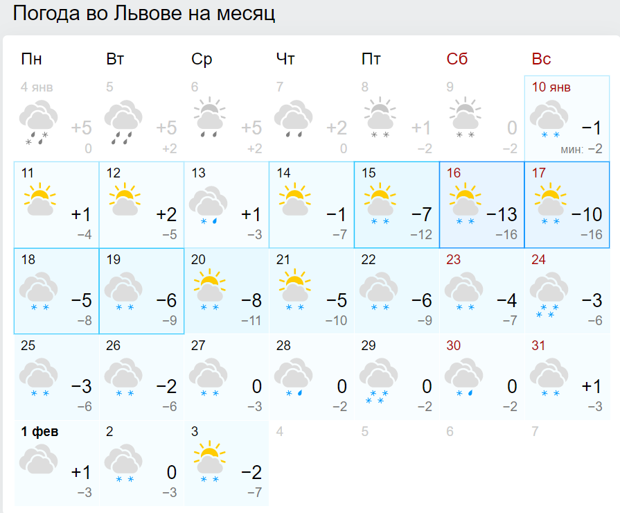 Найхолодніше буде мешканцям сходу України: там міцні морози триматимуться довше, ніж в інших регіонах. Прогнозується мінімальна температура до -20 -22 градусів вночі, вдень - від -12 до -15.