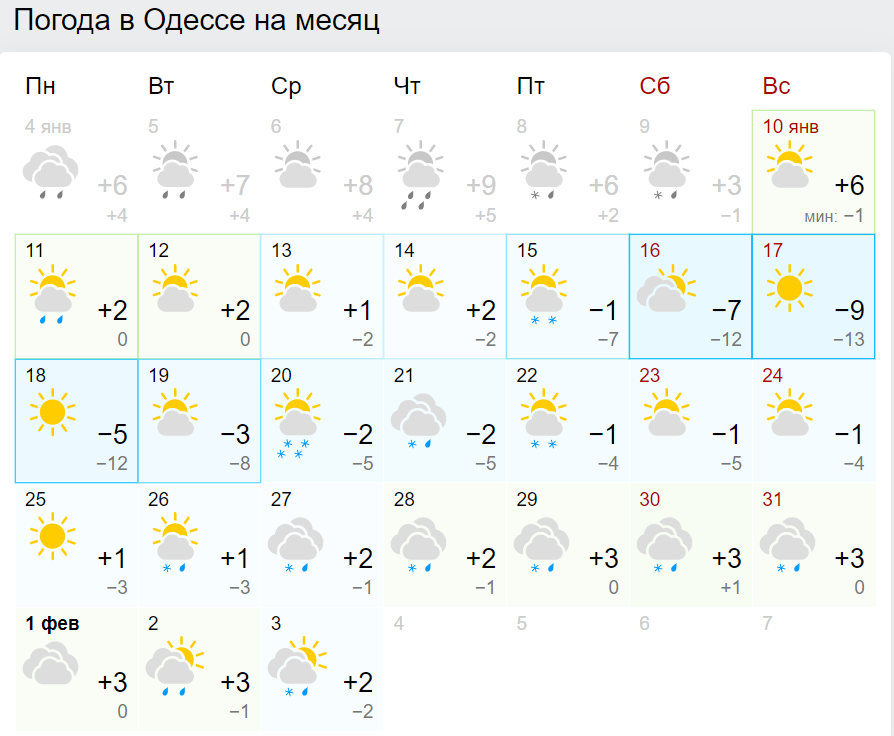 Тепліше буде на півдні України: так, в Одесі вдень можливо до -9, а вночі максимальний мороз не повинен переступити позначку -13.